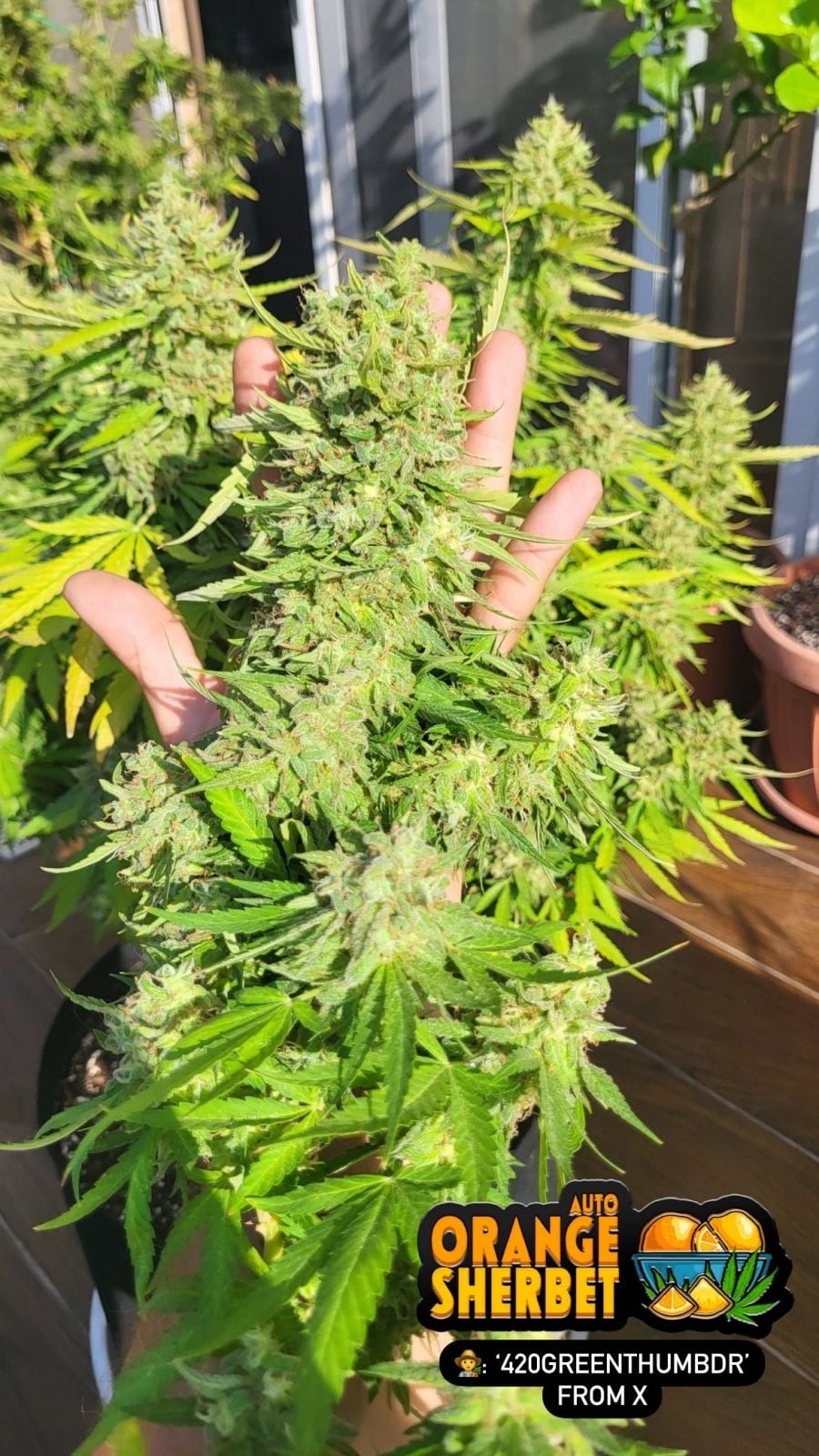 Orange Sherbet Auto bildet spatenförmige, hellgrün gefärbte Buds mit vielen dicken, orangefarbenen Haaren aus, die mit Trichomen überzogen sind und ihr ein komplett weißes Aussehen verleihen. Darüber hinaus lassen die großen Blütenkelche die großen, dichten Knospen aussehen, als ob sie übereinander gestapelt wachsen würden. Wenn man die Knospen aufbricht, kommt ein köstliches, sehr ausgeprägtes Zitrusaroma von frisch gepressten Mandarinen und Orangensaft zum Vorschein, mit einem scharfen, sauren, fast tropischen Hintergrund und subtilen Anklängen von Erde und Kiefer. Dieses einzigartige Terpenprofil führt zu einem stechenden, funky, zitrusartigen, gasigen Geruch, der dir das Wasser im Mund zusammenlaufen lassen wird!