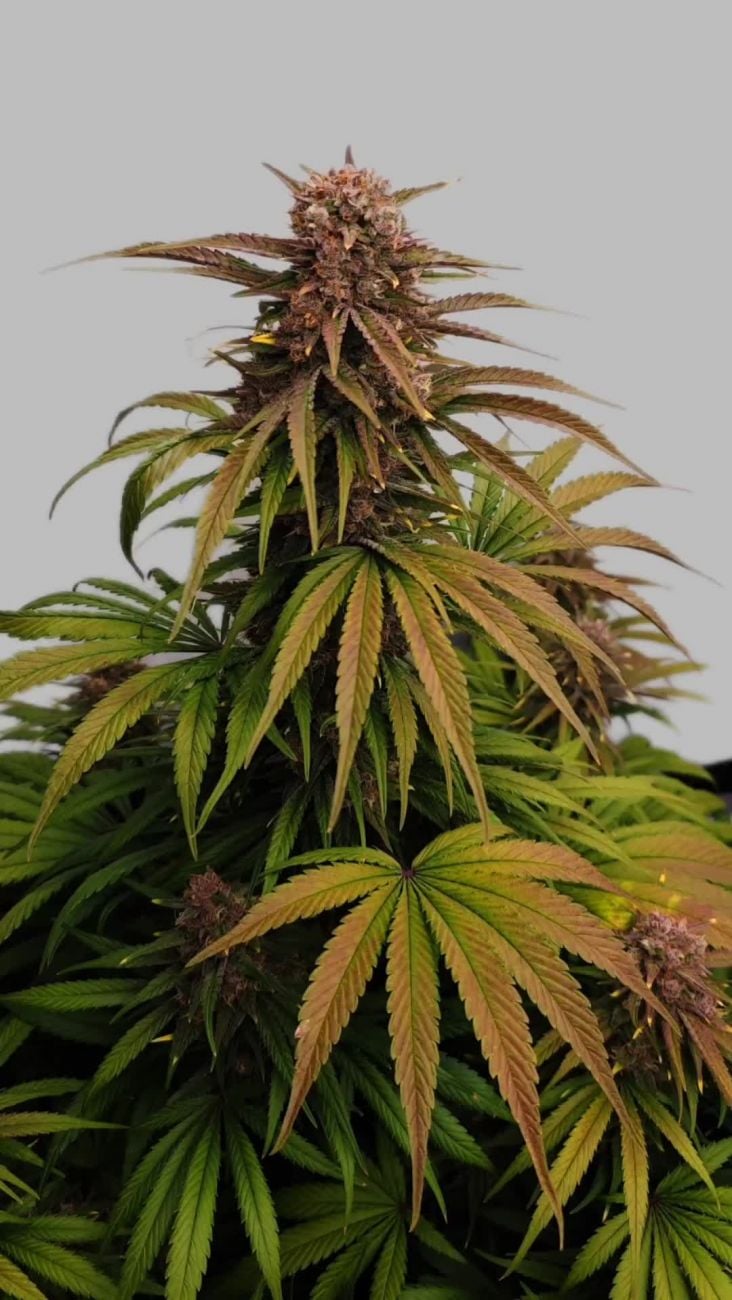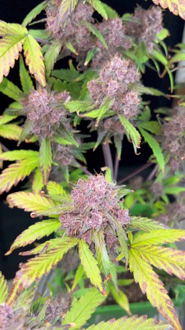 Dès le début de la floraison, la majorité des plantes a présenté des teintes violettes précoces aux nouveaux sites de têtes, qui se sont étendues tout au long du cycle. Lorsque l’élongation de la floraison ralentit, les têtes prennent rapidement du volume. Les terpènes sont très puissants, dégageant une forte odeur de fruits rouges sucrés avec une note de parfum chimique qui chatouille le nez. Cette variété semble similaire à Purple Lemonade ou Crystal Meth, cependant la densité des têtes donne des rendements plus élevés. A très bien résisté au stress. Un bon palissage permettrait probablement d’obtenir des rendements extrêmement élevés dans des conditions optimales.