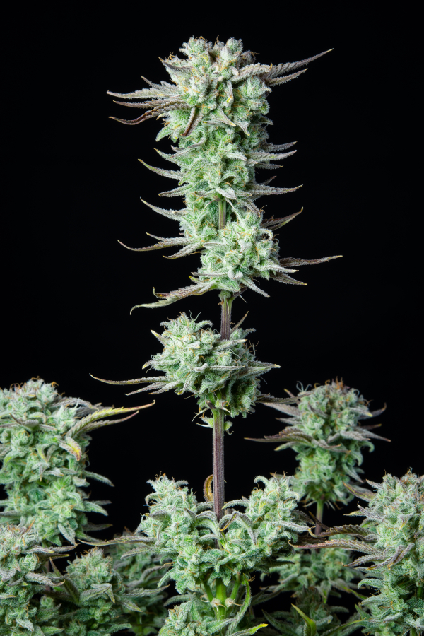 Cette variété pousse vigoureusement et montre clairement son héritage mixte. Le cola principal devient grand, atteignant jusqu\'à 150 cm, suivi de plusieurs branches latérales qui restent courtes par rapport au cola principal, mais qui poussent quand même assez longtemps et développent plusieurs sites de floraison qui se couvrent complètement de bourgeons gras de haut en bas. Cette variété reste compacte et, malgré sa hauteur, conservera cette structure typique de l\'Indica jusqu\'à la récolte, où elle finira par ressembler à une belle Indica atypiquement énorme.