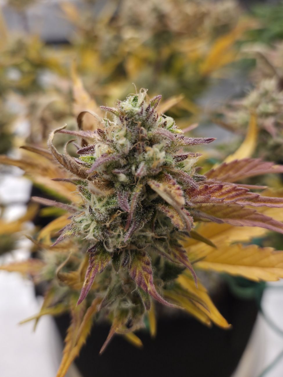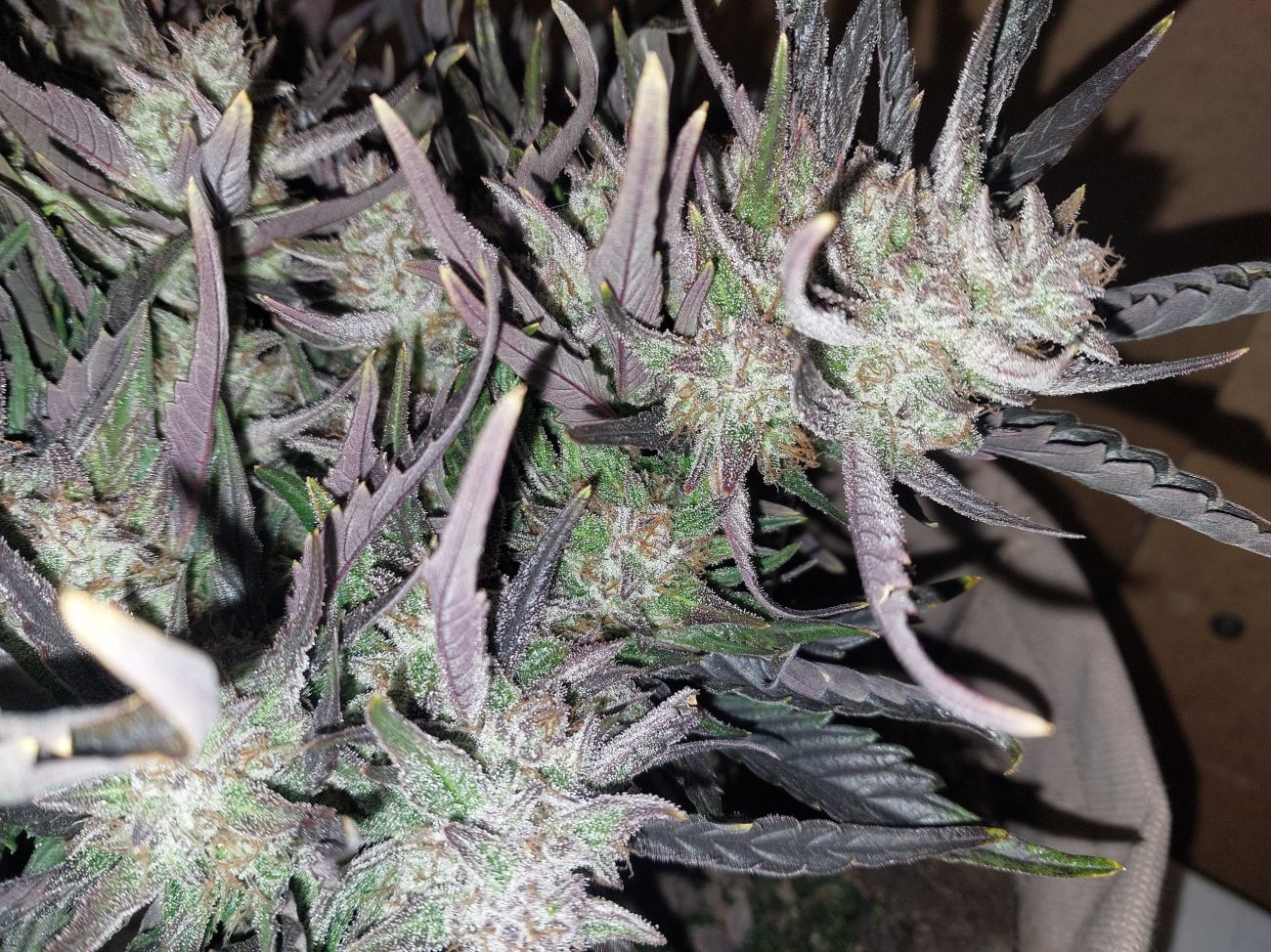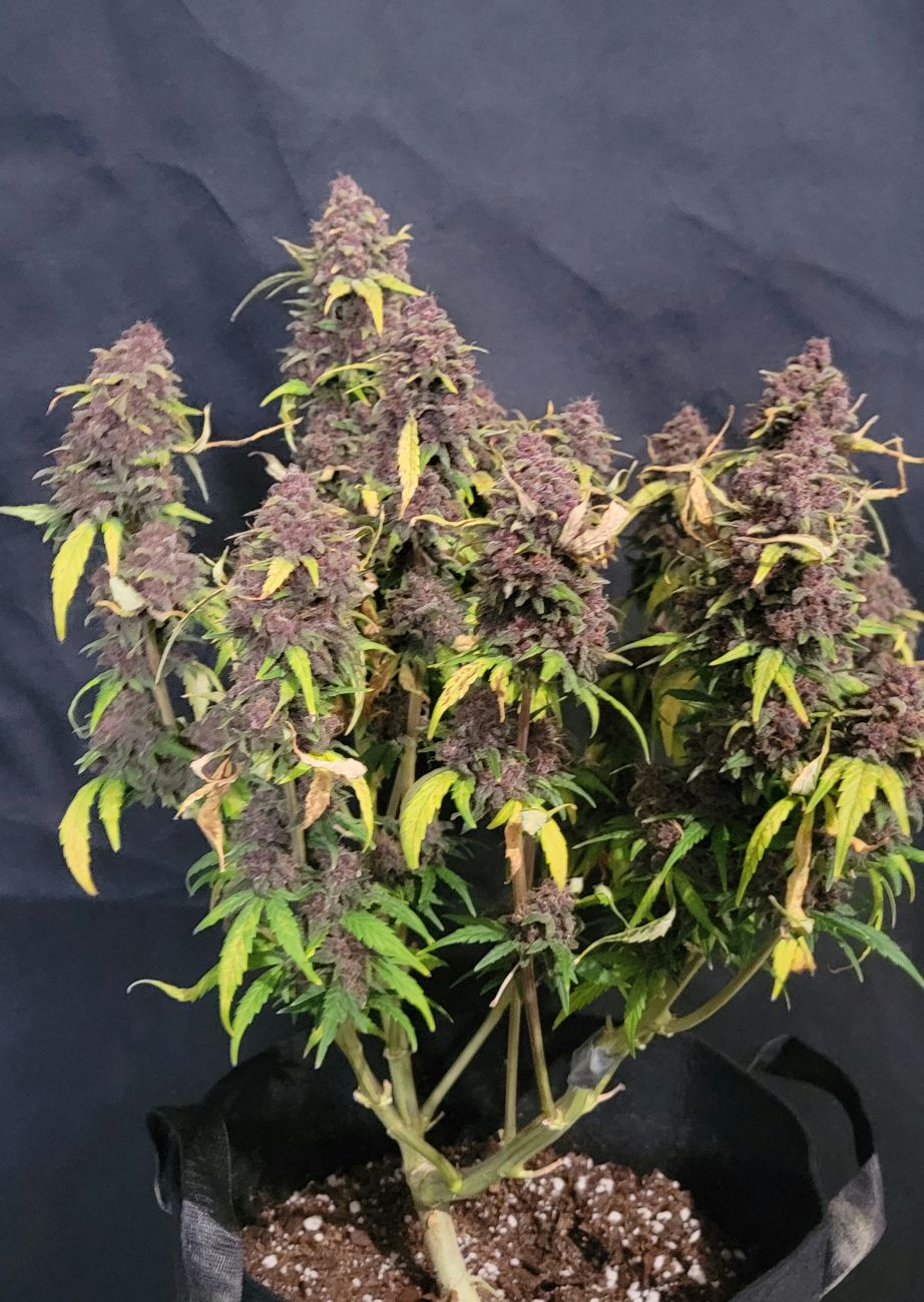 Grazie all\'eredità Indica, questa pianta presenta una spaziatura internodale corta, dando così l\'impressione che su ogni singolo ramo stia crescendo una cima enorme. I bellissimi fiori lilla scuro contrastano perfettamente con le ampie foglie a ventaglio che, verso la fine della fioritura, sfumano in una bella tonalità verde chiaro.