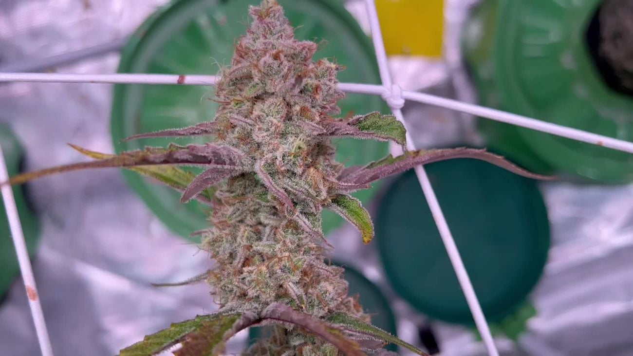 Grows fast and strong with potential to be a very quick finisher. Suitable for beginners. Withstood general stress nicely. By mid flower sweet Candy like nose. The pink pistil pheno had a later start to bloom has a more sativa dominant look to it with thin fan leaves and a good stretch. The buds on the 2nd one were coated in a sheen like resin with a sweet tart like aroma that slaps you in the face. The potency seems to be much higher than previous purple strains I’ve smoked and tasted incredible.