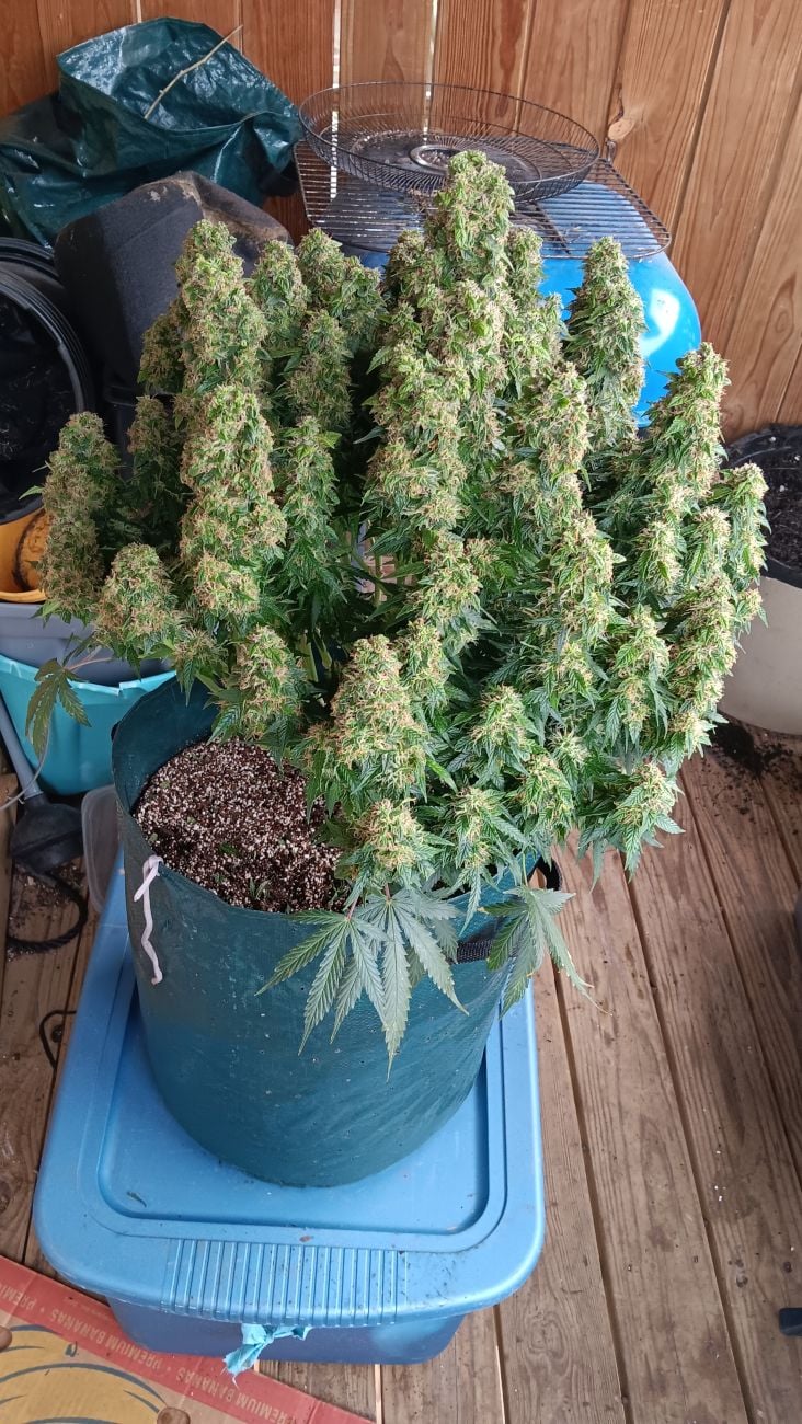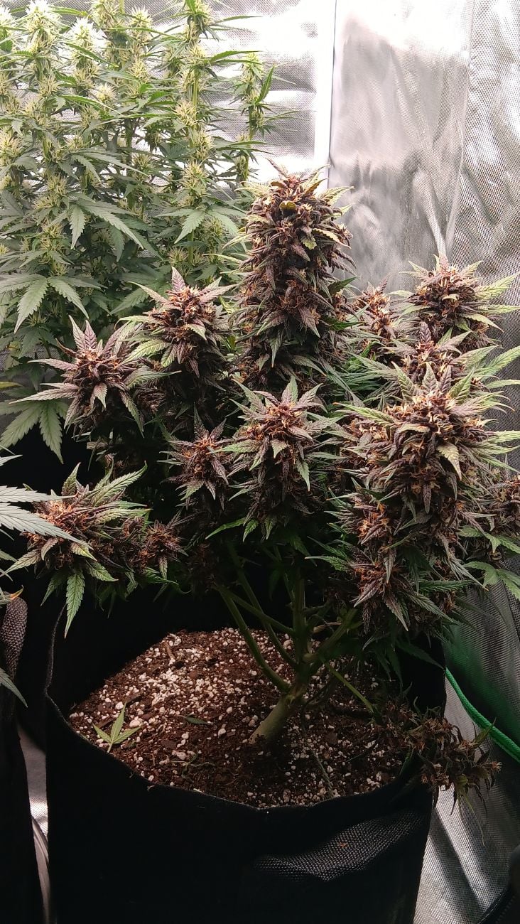 This plant was easy to grow. Live soil, 7.5 gal fabric pots.. bottom feed and top feed once in a while. Organic with some nutes added like Gaia green.. I will say.. each pheno gave off a different characteristic as can see in the pictures. And all seeds came from the same pack. One had dark purple leaves and buds. The other only had purple lightly in the bud. Pictures of both purple punch autos are around 5.5 -6 weeks old.. 3 weeks left MAX maybe even less. Wil definitely get more seeds after my other experimental seeds run out