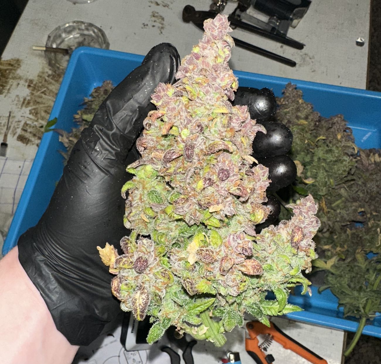 Regardless of the fact that she was late because of my mistake at the beginning, she still forgave me a little and gave me some flowers. Papaya's flower color leaves you speechless. Purple flower, full of aroma. It smells just like cookies. It responds well to LST, likes nutrients. I combined natural light and a lamp (when the temperatures were lower (due to the difference in temperature, I got an intense purple flower). Strong effect. I am very satisfied.