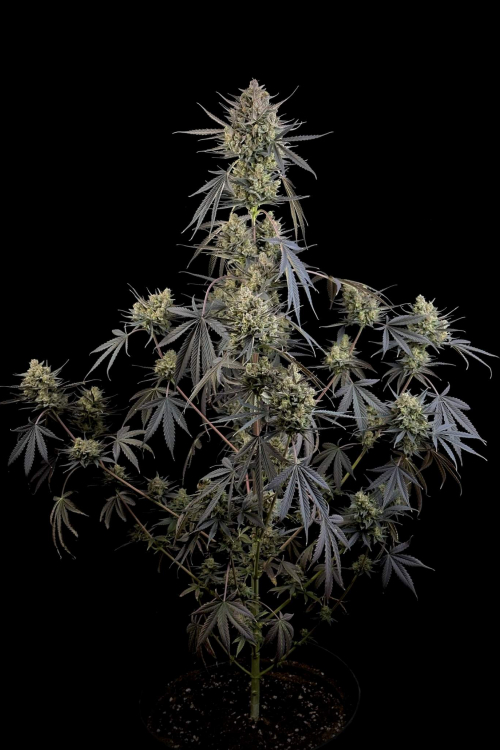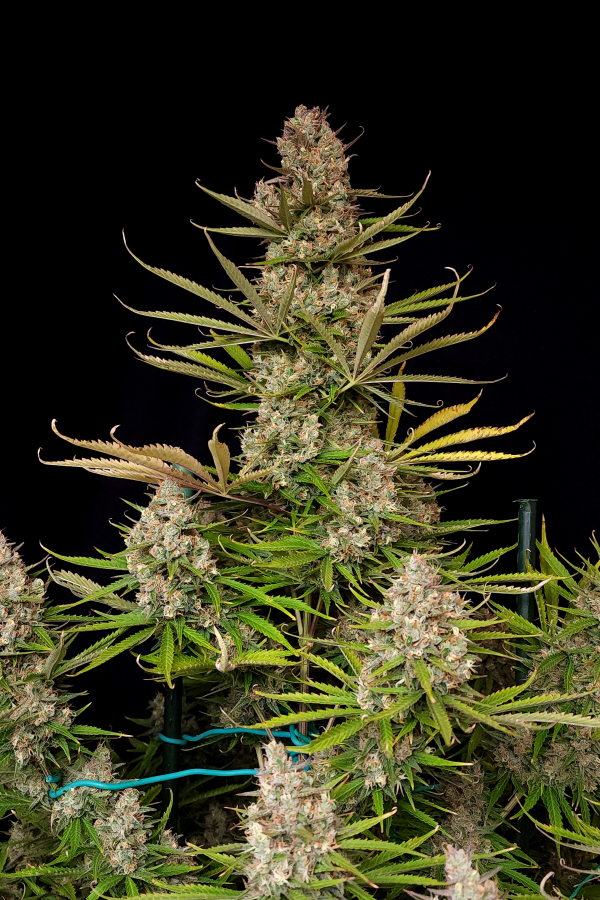This variety will show traits of both Indica and Sativa varieties, developing a tall main cola that reaches up to 150 cm in height and multiple shorter side branches that will get completely covered with buds by harvest time.