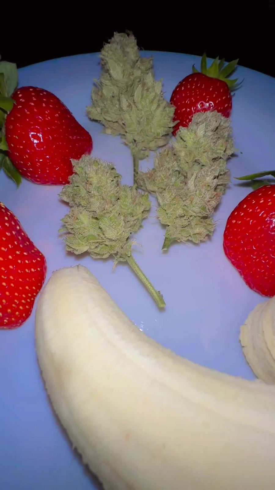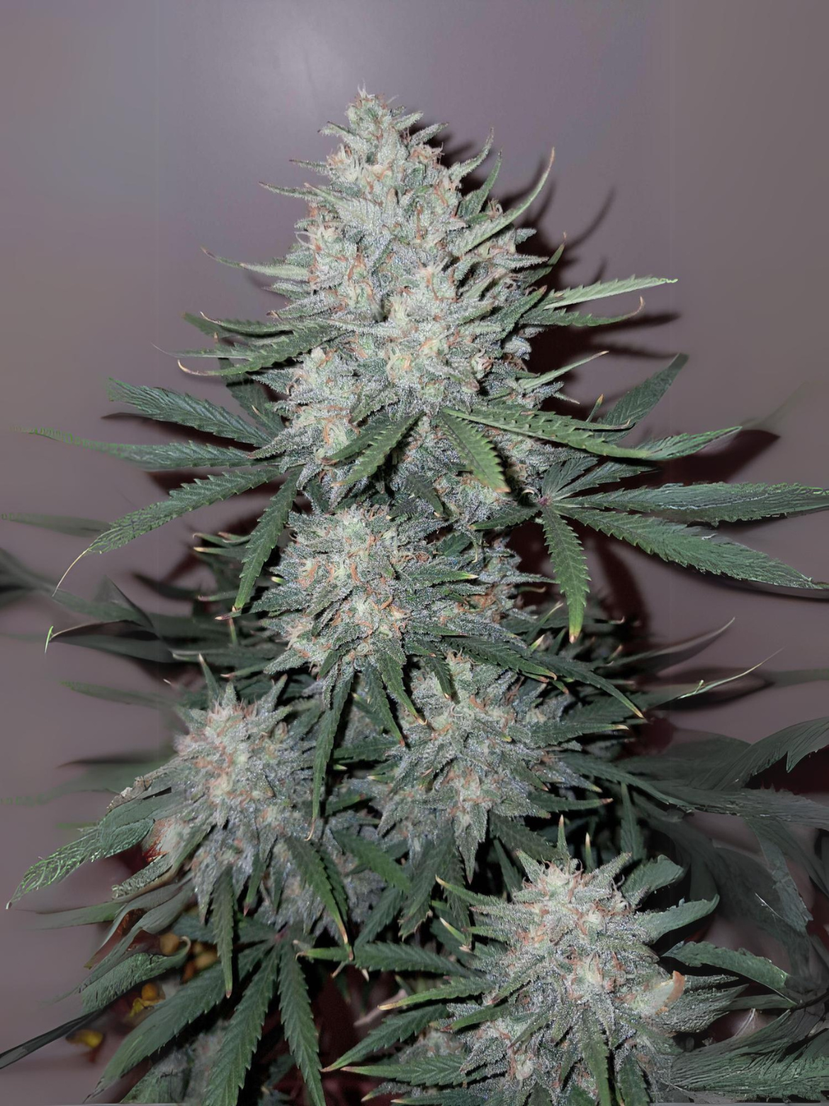 Her structure blends classic Indica bulk with hybrid vigor: a dominant central cola, heavy side branches, and frosty, spiked buds dripping in trichomes. The flowers boast a sweet, tropical aroma that blends ripe strawberry with creamy banana: loud, sticky, and tailor-made for extractors chasing flavor and frost.