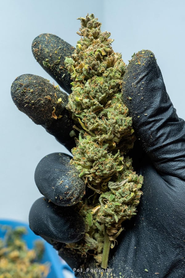 ดอกกัญชาที่มีรสชาติผลไม้หวานอร่อย และมีความเหนียวเหนอะหนะด้วยเรซินมากมายที่อุดมสมบูรณ์ทำให้ดอกแข็งเป็นก้อนๆ ซึ่งจะสลายตัวเมื่อคุณบดมันลง