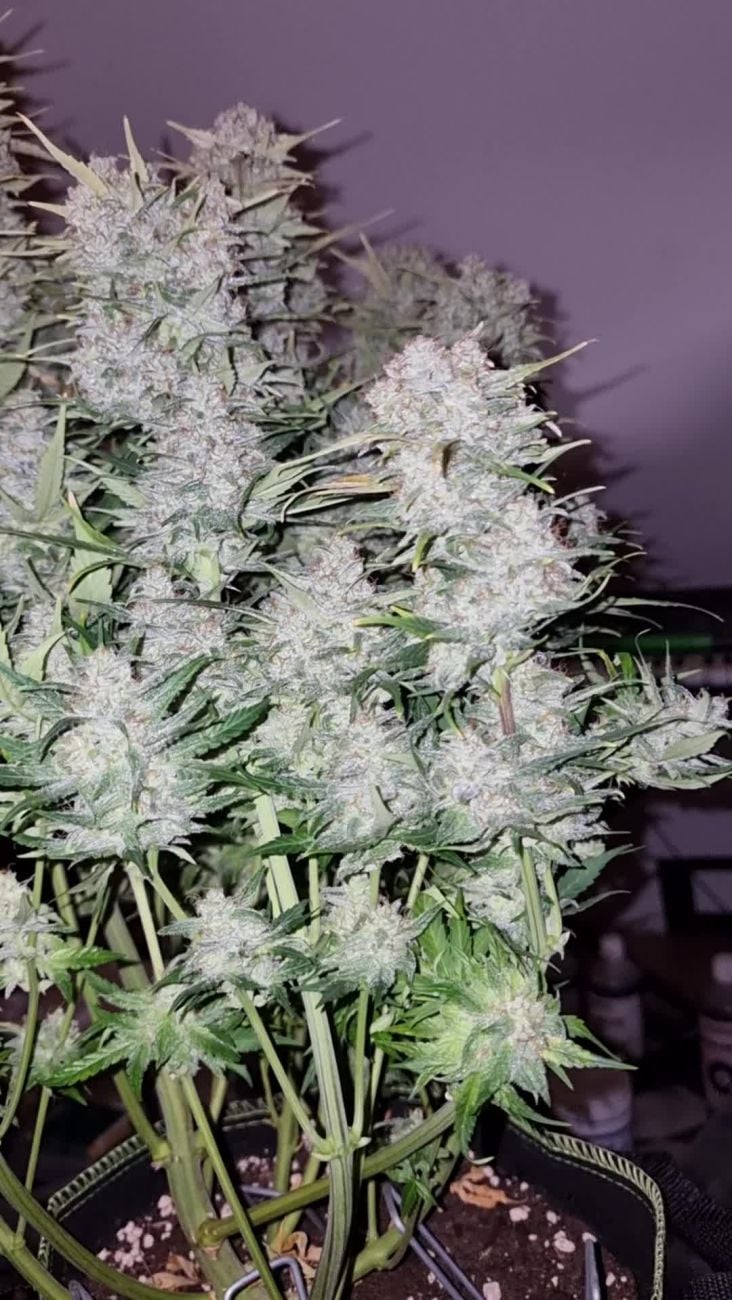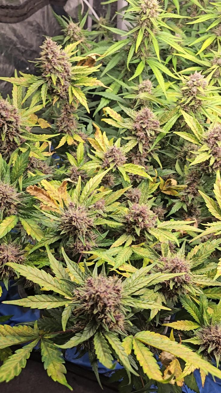Due to the Indica heritage, this plant has short internodal spacing which gives the impression that each individual branch is growing one massive bud. The beautiful dark lilac flowers contrast perfectly with the wide fan leaves that fade into a beautiful light green hue by the end of flowering.