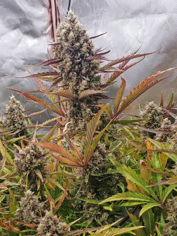 Even though it can grow up to 1m, this cultivar stays very compact while delivering up to 550gr/m2. It grows one tall main cola with large thick fan leaves, typical of Indica strains, and very symmetrical side branches that are enveloped in beautiful buds from top to bottom. The buds can develop reddish tones, flurried with pink and purple while packing frost like crazy, she will be completely covered in strawberry scented trichomes by harvesting time.