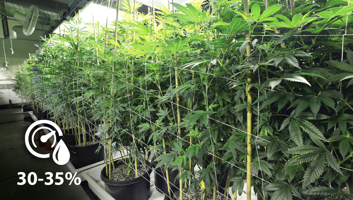 Unser Tipp ist hier, die Feuchtigkeit bei 30-35% zu halten und einen frei fließenden Frischluftstrom zu fördern. Sorge dafür, dass auch die unteren Teile der Pflanze frische Luft erhalten und dass ein ausgewogener Luftstrom die Ober- und Unterseite der Buds erreichen kann.