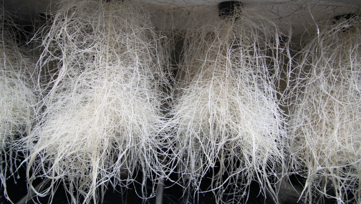 Aeroponik ist eine Art des Anbaus, bei der die Wurzeln durch ein spezielles Netz oder einen Topf mitten in der Luft gehalten werden. Anstatt von Erde umgeben zu sein, sind die Wurzeln von Sauerstoff und CO2 umgeben und werden alle 3-5 Minuten direkt mit einer Nährlösung befeuchtet, die die gesamten Wurzeln umhüllt.