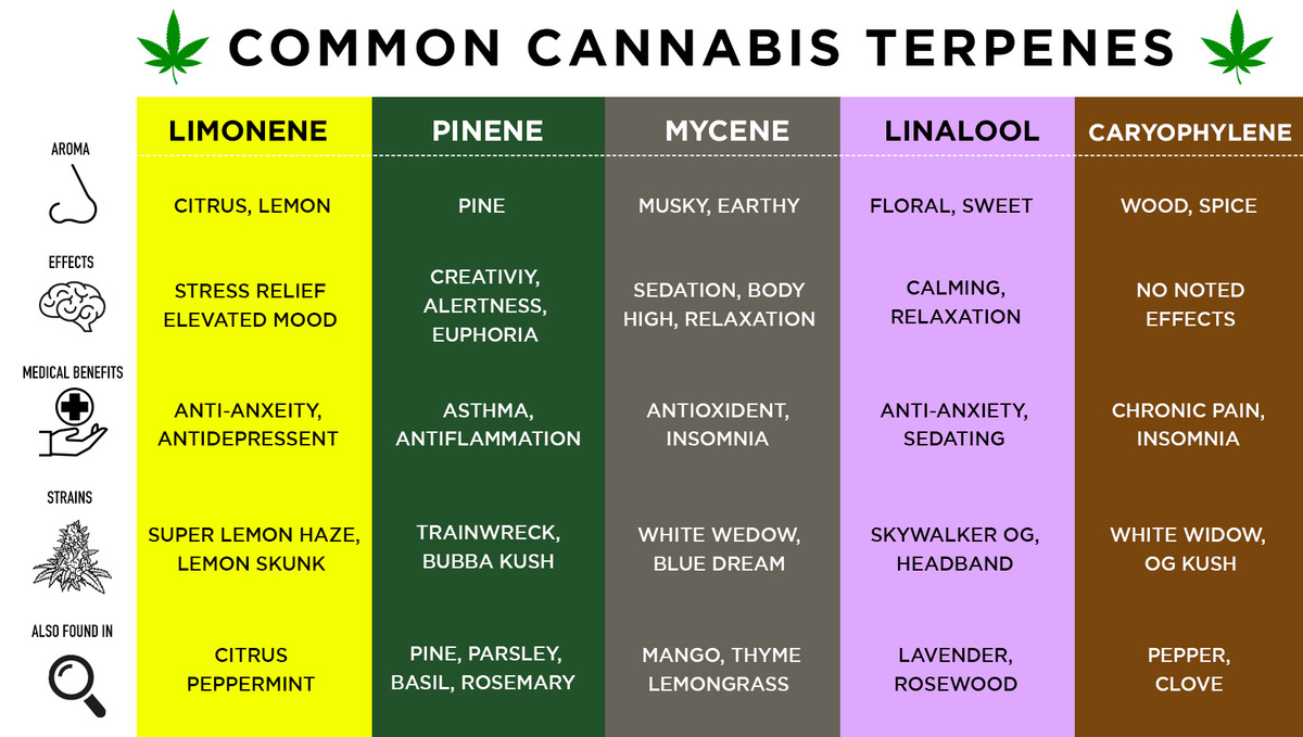 Terpene sind dafür verantwortlich, den Blüten ihren Geschmack und ihre aromatische Vielfalt zu verleihen. Es hat sich gezeigt, dass Terpene mit Cannabinoiden zusammenarbeiten, um ihre natürlichen Eigenschaften zu verbessern. Wie Cannabinoide, interagieren Terpene mit Rezeptoren, um eine Vielzahl von Wirkungen zu erzielen.