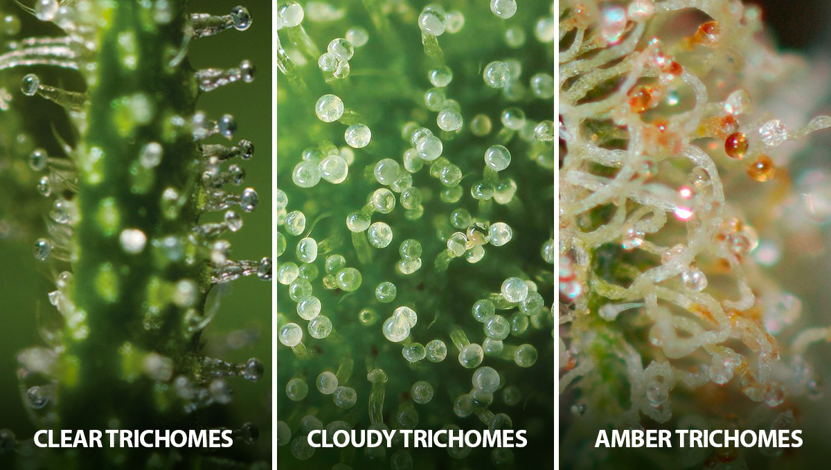 Trichome sieht man, sobald die Pflanzen in die Blühtephase eintreten. Sie erscheinen gegen Ende des Lebenszyklus und befinden sich auf dem Höhepunkt ihrer Potenz, wenn die Pflanze erntereif ist.