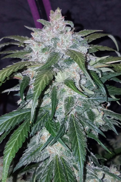 These are the frostiest nugz I've grown yet. Trichomes all the way to the fan leaves, absolutely amazing and beautiful to behold. This gal finished at least a week early with 99% cloudy trichomes when I yanked it. Tangie auto induces a tangieble high, and I kind of waved off the "mere" 24% THC as my last two from FB were 29% and were absolutely stellar but I was mismoken. This is a fine fine pleasure to relax with. Have yet to cure it but it's smoov like mayo and pretty tasty out the 3-foot ice-bong. Snag a seed or two of this strain, you will be happy that you did! :)